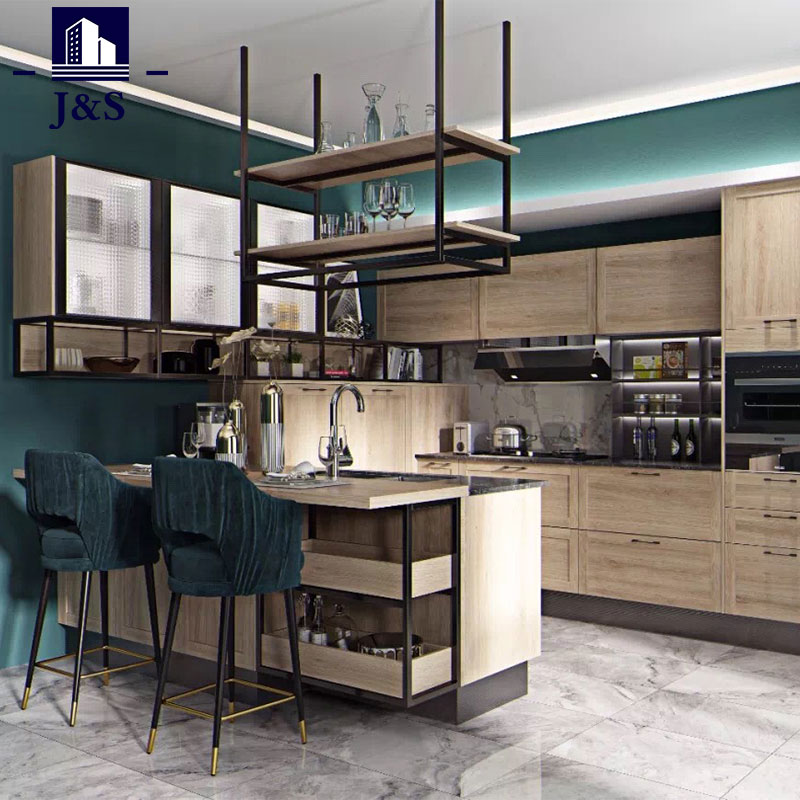 J&S HOUSEHOLD е компания, посветена на предоставянето на клиенти по поръчка на решения за целия им дом. Предлагаме проектиране и преработка на отворена луксозна кухня. Този комплект приема дизайн на отворена кухня, който е интегриран с врати на стенен шкаф от закалено стъкло, помещение за съхранение на храна от дървен фурнир и островна основа с кафява боя. Ярките стъклени рафтове с LED правят шкафа по-топъл и ослепителен, създавайки луксозна текстура от висок клас.